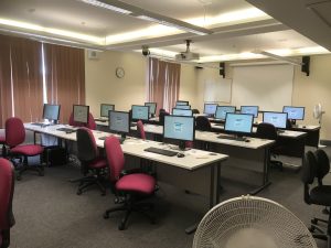 The room has 20 desks, use of a printer, and a trainer’s/presenter’s PC with a projector and screen. Each desk is equipped with a PC and height adjustable wide screen monitor.